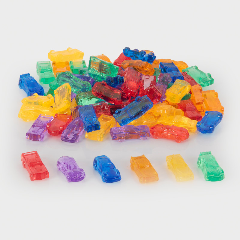 A készlet 72 átlátszó autót tartalmaz 6 színben (piros, narancssárga, sárga, zöld, kék és lila) egy fedeles tárolóedényben.