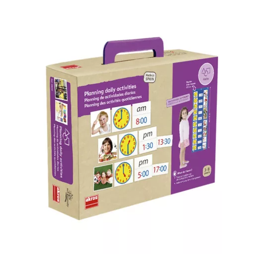 - 1 szövetpanel műanyag zsebekkel (105 x 35 cm)- 36 képkártya (9 x 9 cm)- 36 kártya (9 x 9 cm)- 72 kártya óra (9 x 4,5 cm)- 12 kártya am / pm (9 x 9 cm)
