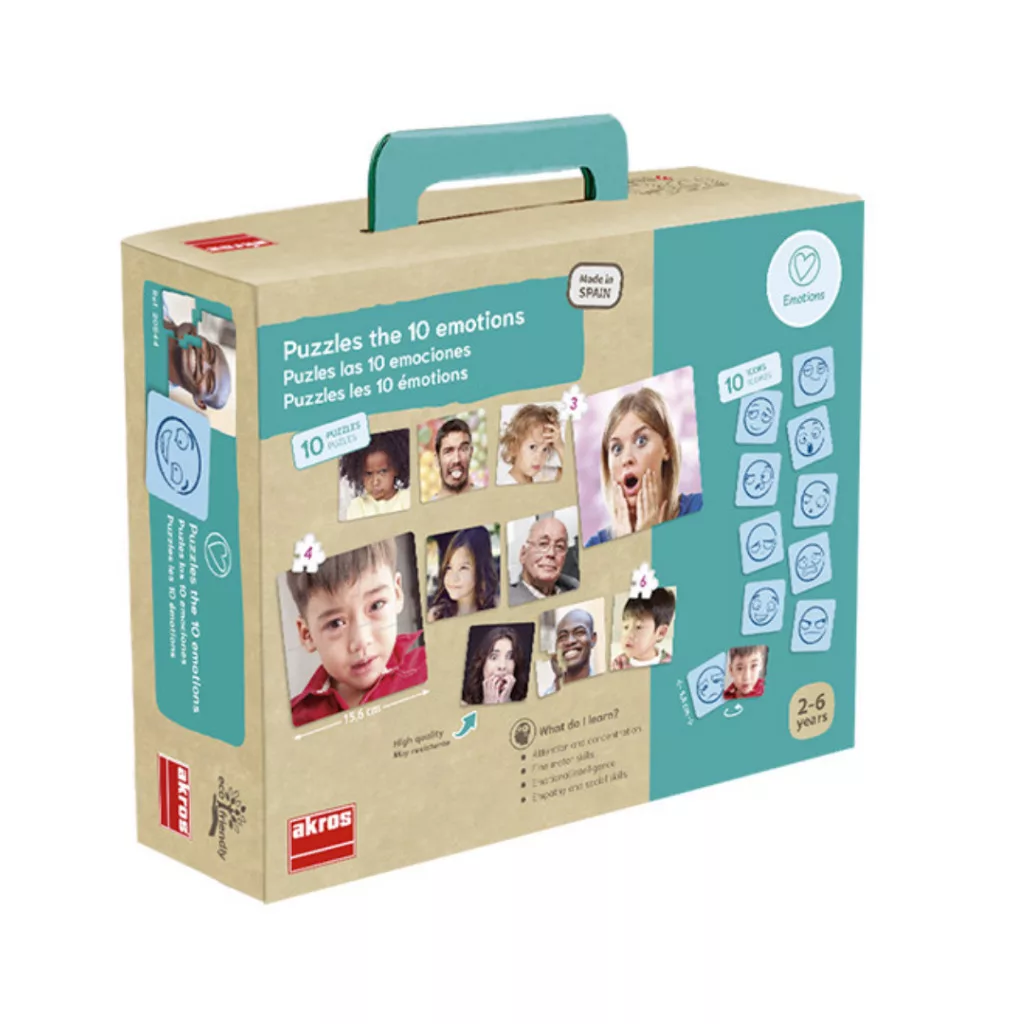 10 puzzle, amely tartalmazza a viselkedésünket vezérlő alapvető érzelmeket, valamint 10 megfelelő ikon, amelyek segítenek azonosítani őket: boldogság, önbizalom, csodálat, kíváncsiság, meglepetés, düh, undor, szomorúság, félelem és bűntudat.