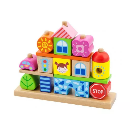 Ez a négysoros mini város színes, kiváló minőségű fából készült blokkokkal van felépítve. 8 pálcával, 4 mintával és 14 különböző blokkkal rendelkezik. Keverd össze és rakd össze a darabokat újra és mondd el a városod történetét!