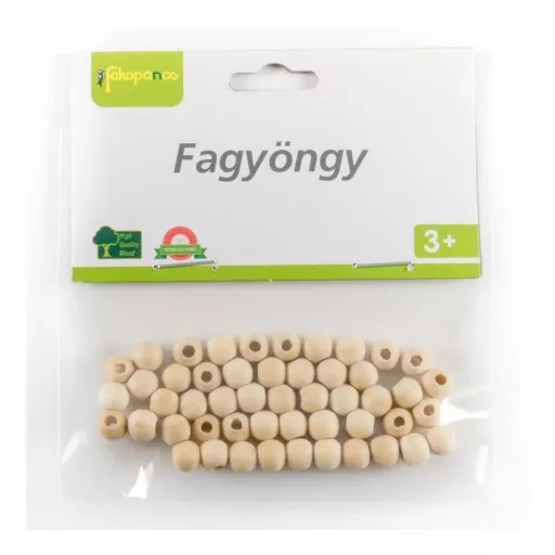 Fából készült natúr fagyöngyök. Kiválóan fejleszti a kézügyességet és a kreativitást. Alkalmas kislányoknak és kisfiúknak is egyaránt. A remek és szórakoztató tevékenység során fejlődik a gyermekek finommotoros készsége, aminek nagy hasznát veszik az első betűk leírásánál. Hozzájárul a számok megtanulásához és a számolás gyakorlásához is. Óvodás kortól ajánljuk a terméket otthoni vagy intézményben való használatra. Kreatív üzletek elengedhetetlen terméke, ünnepi díszek elengedhetetlen kelléke, például angyalka fejet tudunk belőle készíteni.