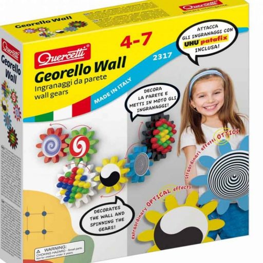 A Quercetti újításának köszönhetően már a szobánk falát is dekorálhatjuk ezzel az összesen 72 darabos Georello fogaskerék játékkal. A különböző színű, és kétféle méretű fogaskerekeket a tartozékokkal mi magunk dekorálhatjuk. Ettől lesz különleges hatása az egész rendszer mozgásának, amikor megforgatunk egy fogaskereket. A készletben levő, újra használható, kétoldalán is tapadó ragasztólapocskák (UHU Patafix gyurmaragasztó) teszik lehetővé a függőleges felületen való építést. A Georelló elemek újra és újra átrendezhetők, más-más fogaskerék rendszert kialakítva.