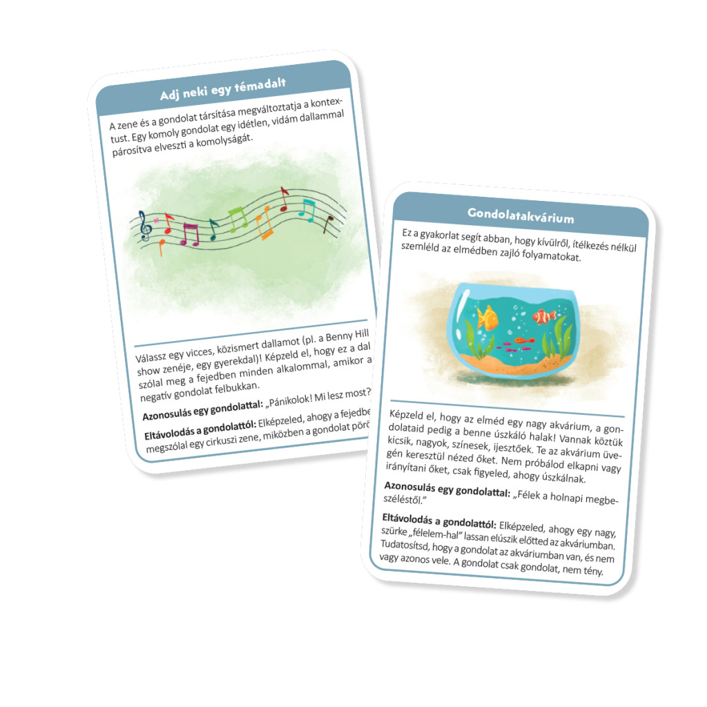 Sajnos hajlamosak vagyunk könnyen a fájdalmas gondolatok és érzelmek fogságába esni és ilyenkor ezek a gondolatok és érzések nemcsak lehangolnak minket, hanem irányítják a viselkedésünket is. Ezt nevezzük a gondolatokkal való eggyé válásnak. A kártyacsomagban lévő gyakorlatok segítenek kiutat találni ebből a csapdából azáltal, hogy megtanítanak, hogyan teremts távolságot közted és a fejedben kavargó gondolatok között.