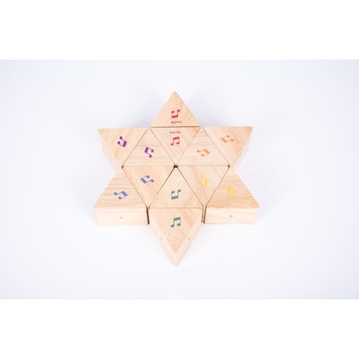 A készlet 6 pár gyönyörű, keményfa háromszöget tartalmaz. A háromszögek megrázásával különböző hangokat adnak ki és hang alapján párosíthatóak. Ellenőrzés képpen mindegyiken található egy színes hangjegy, amely az azonos hangzású párokon megegyezik. A hangjegy csak a háromszögegyik oldalán látható, így azok fejjel lefelé fordíthatva nehezítik a párosítást.