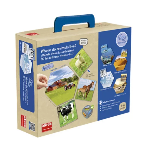 - 5 élőhely mesterkártya (oldal 7,5 cm)- 1 maxi kocka (3,5 cm)- 30 állatkártya (7,5 x 7,5 cm)