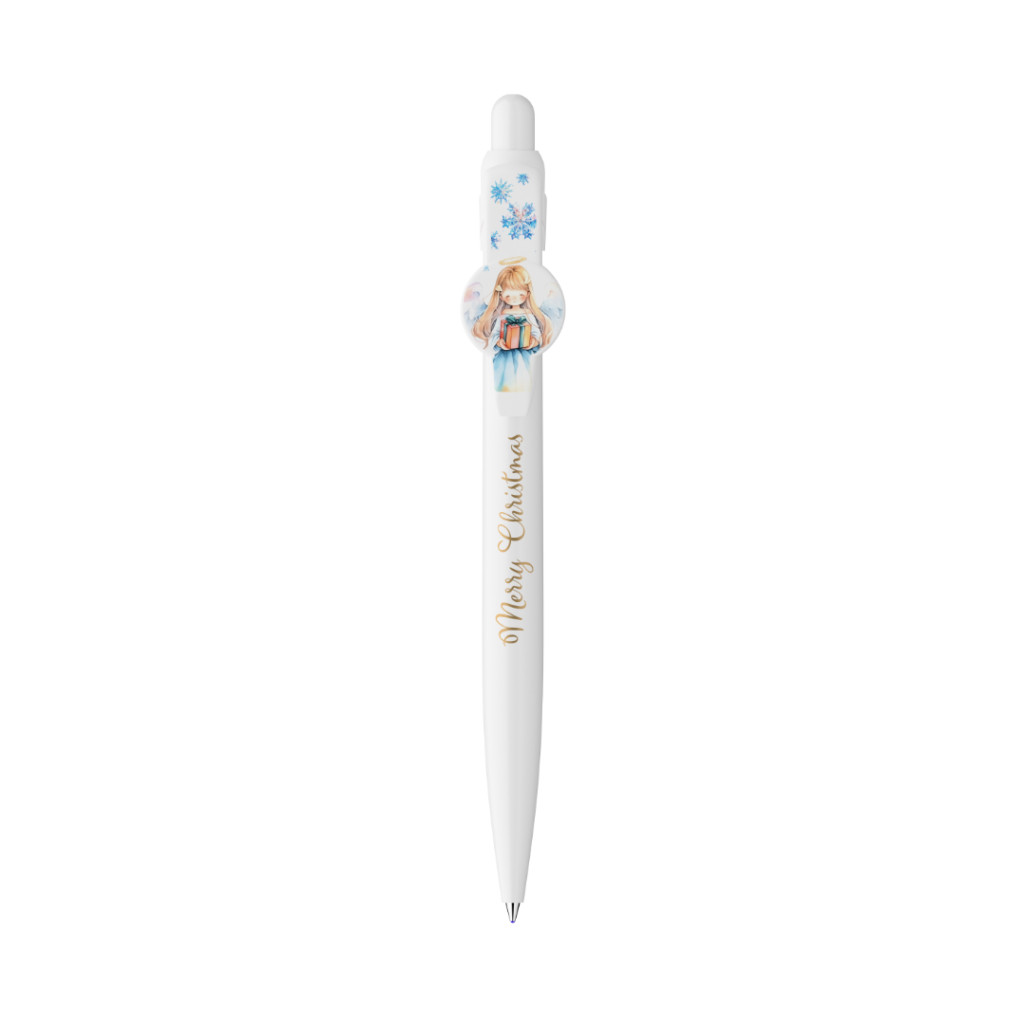 Angyallal díszített nyomógombos mechanikával működő golyóstoll 0,8 mm-es kék színű golyósbetéttel.