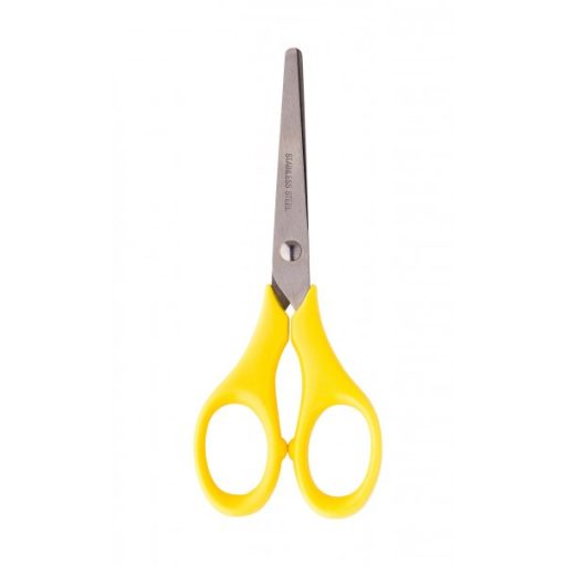 Hegyes végű, fém iskolai olló, színes, műanyag nyéllel. Mérete: 13,5cm