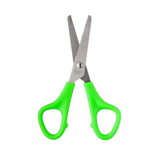 Iskolai olló kerekített vágóél balkezes használatra, méret: 13,5 cm.