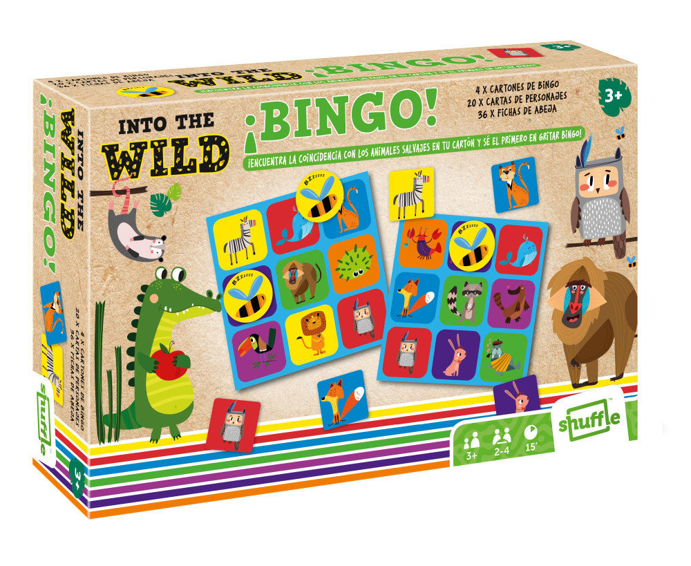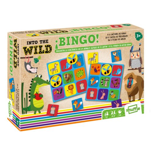 Bingó játék, vadállatok mókás rajzaival, 4 darab bingó táblával, 20 darab bingó lapocskával és 36 darab számoló méhecske koronggal.