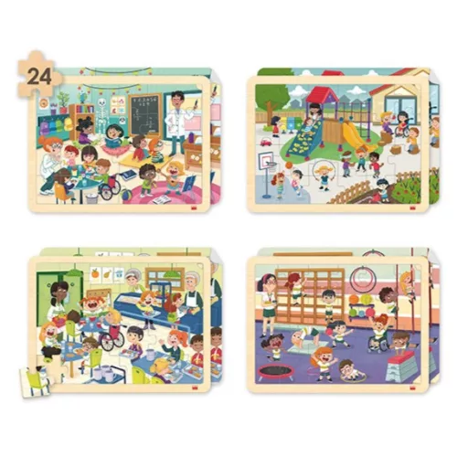 4 db 24 darabos fa ECO puzzle-t tartalmazó csomag. Tartalmazza: az osztálytermet, a játszóteret, az ebédlőt és a tornatermet.