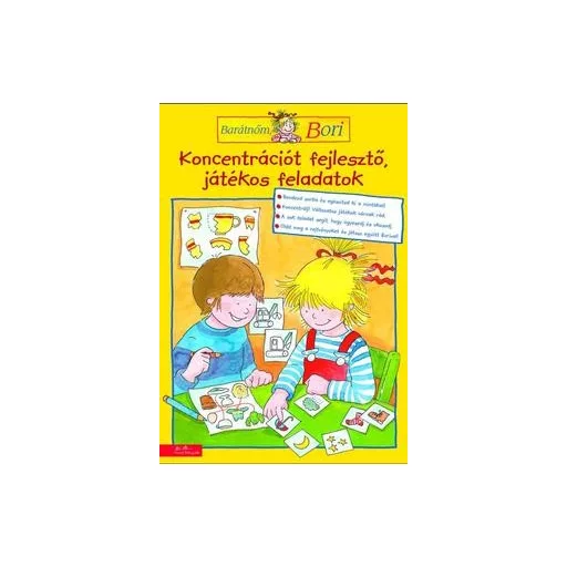 A Barátnőm, Bori foglalkoztató füzet-sorozatának ez a része a nagyóvodásoknak segít, hogy játékosan tanuljanak összpontosítani egy-egy feladatra. - Találj meg minél több egymáshoz illő kártyapárt Bori képkeresőjével! - Felismered, melyek az apró különbségek a látszólag egyforma képek között? - Ismerd meg a sebesség és az irány fogalmát! - Változatos rejtvények és keresők várnak Bori minden barátjára és barátnőjére!