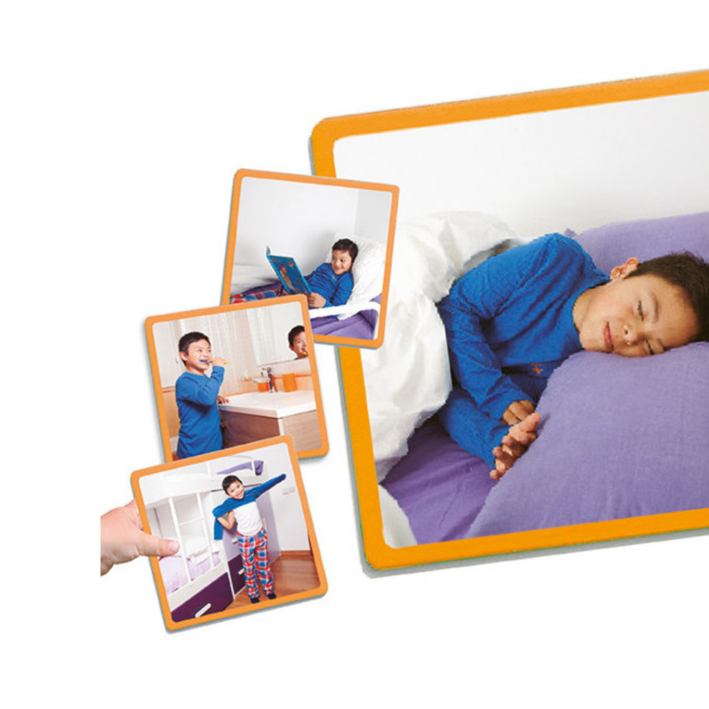 A játék 20 db vastag kartonkártyából áll. A kártyák méretei: 11,5 x 11,5 cm. A csomag 5 különböző, egyenként négy lépésből álló cselekvéssort tartalmaz.