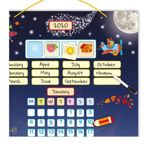 A csomagban 4 évszakkártya, 31 számkártya, 20 időjáráskártya és egy letörölhető filc található.