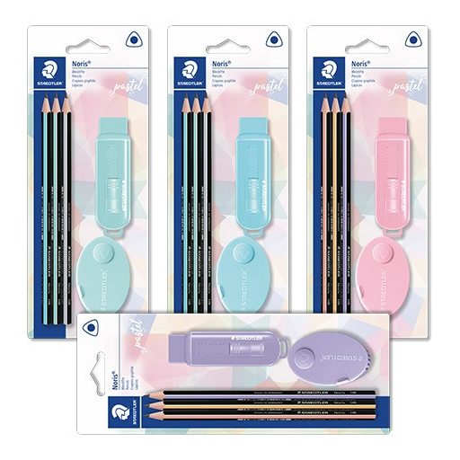 A készlet tartalma: 3 db háromszögletű grafit HB, 1 db PVC mentes radír műanyag tokban, 1 db 2 lyukú műanyag hegyezőt forgácstartállyal.