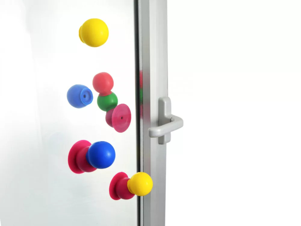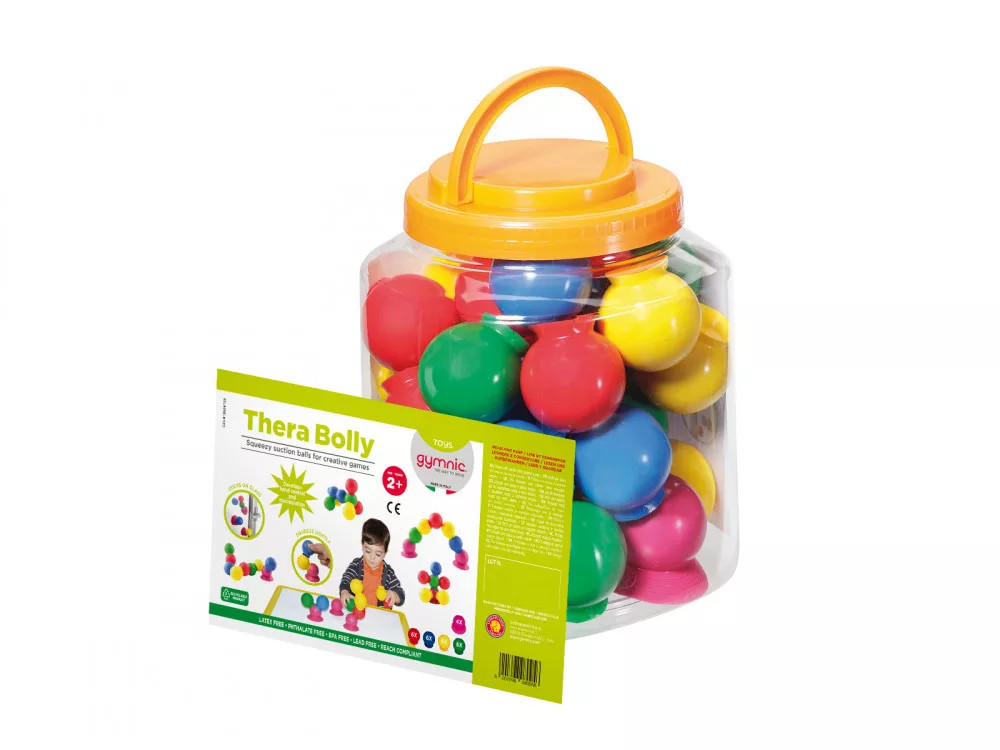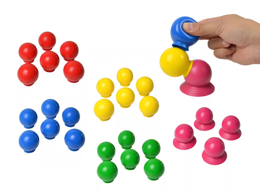 A kiváló minőségű elasztikus kislabdák pici talpacskái, picit megnyomva őket, a vákuum segítségével egymásba tapaszthatók, így különböző érdekes figurák képezhetők belőlük.