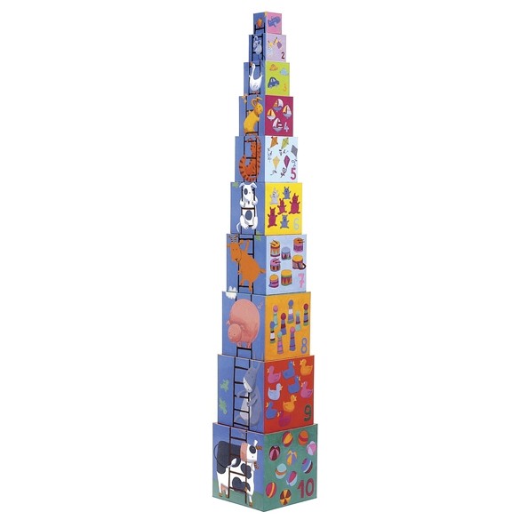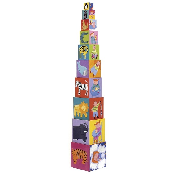 A kicsik játék közben ismerkedhetnek meg az állatok nevével, a színekkel, a kisebb-nagyobb fogalmával. Sok beszélgetésre inspirálnak a kockák képei. Kiváló minőségű vastag kartonból készült egymásba és egymásra rakható kockák. A legnagyobb kockaméret: 13,5 cm, a legkisebb kockaméret: 3,8 cm. Fényes felülete nedves ruhával tisztítható. A teljes magasság kb. 90 cm.